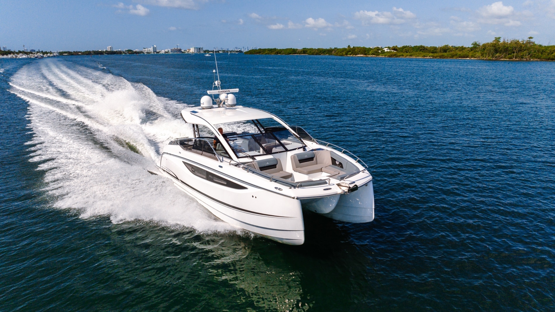 Four Winns erfindet einen Katamaran mit einer Länge von nur 36 Fuß neu, indem es einige wirklich geniale Funktionen einbaut, die es den Eignern ermöglichen, ein völlig neues Segelerlebnis zu genießen. Ich bin sehr neugierig auf diese FOUR WINNS TH 36, deren kompakte Linien und Design vom Dock aus gesehen an ein sportliches Boot erinnern, obwohl sie 4,47 m breit ist.