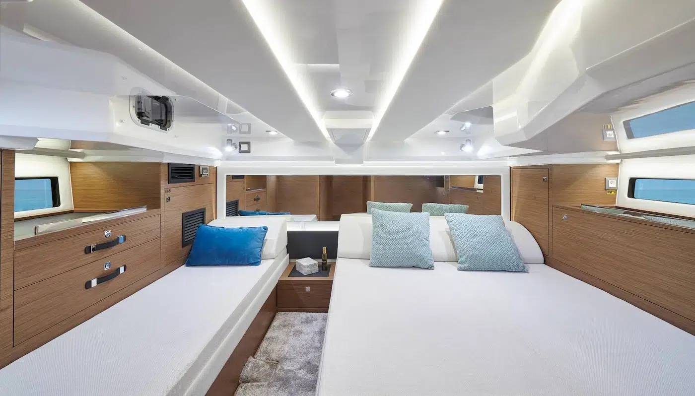 Below deck, the use of high-quality materials is immediately evident, with very light pastel tones that give the space a refined and bright feel, enhanced by the windows on both sides and at the bow. On the port side, there’s a galley equipped with a sink and gas burners, allowing you to cook indoors on colder or rainy days. At the stern, the master cabin features a double bed to port and a small sofa to starboard, which can be joined together to create an extra-large bed. The cabin is fitted with wardrobes and drawers to store clothing and everything needed for multi-day cruises. In the center, to starboard, there’s a spacious bathroom with a separate shower.