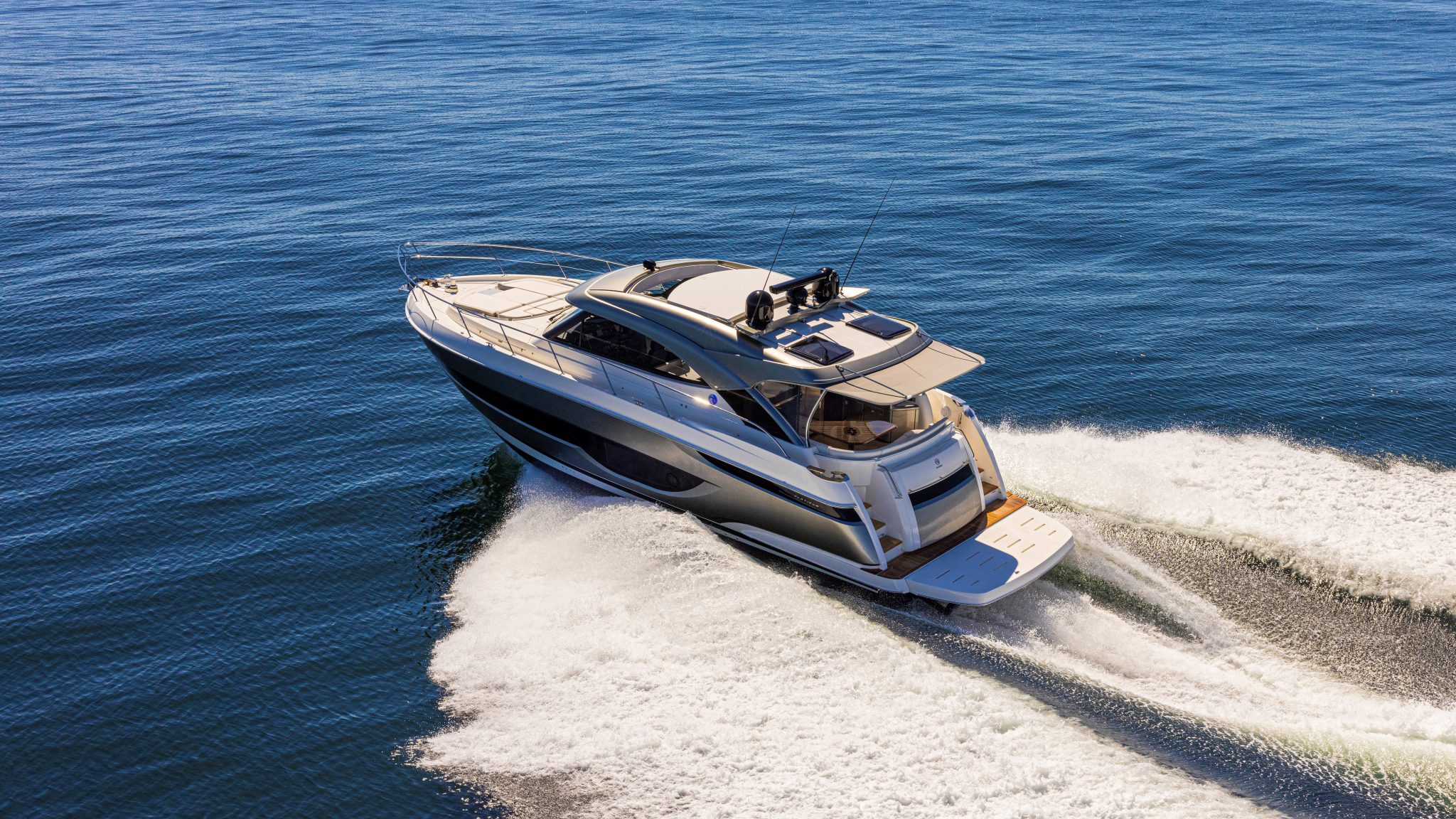 The Riviera 4600 Sport Yacht Platinum Edition stands out for its fine fabrics, walnut polished wood furnishings, stylish lounges and ultra-soft carpeting for bare feet in the cabin. The stunning hard top with two electric sunroofs and the black finishes give the yacht an elegant and aggressive look at the same time.